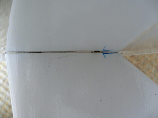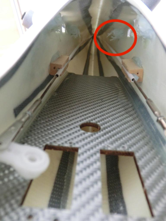 Blick von Seitenleitwerk aufs Höhenruder, unebenes Seitenleitwerk, Höhenruder schleift am Ende, wenn keine Unterlegscheiben verwendet werden, Höhenruder wird noch nachbearbeitet.