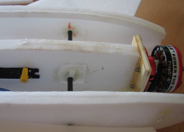 Als Lager wurden nicht, wie im Plan vorgegeben, Holzplatten mit Aluhülsen verwendet, sondern Servohebel aus Kunststoff, welche ich noch übrig hatte, die in den Schaum eingeharzt wurden.