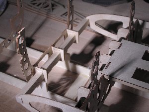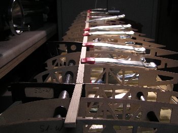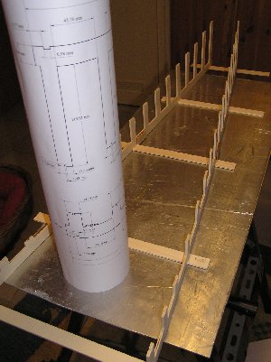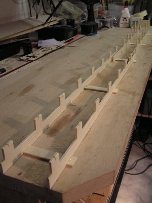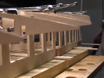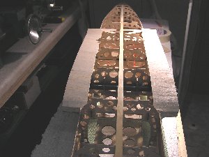 | Nach dem Fräsen wird die Helling montiert. Wie schon aus der o.a. Zeichnung zu erkennen ist, besteht sie aus zwei Teilen. Einerseits ist das notwendig, weil die Fräsmaschine die gesamte Länge nicht herstellen könnte, andererseit ist das zweckmäßig, da die hinteren Spanten schmaler sind und höher stehen. Die einzelnen "Kammzinken" der Helling haben eine kleine Nut, in die eine Nut im Spant exakt hineinpasst. So werden die Spanten genau mittig platziert und die Abstände und Höhen untereinander eingehalten.