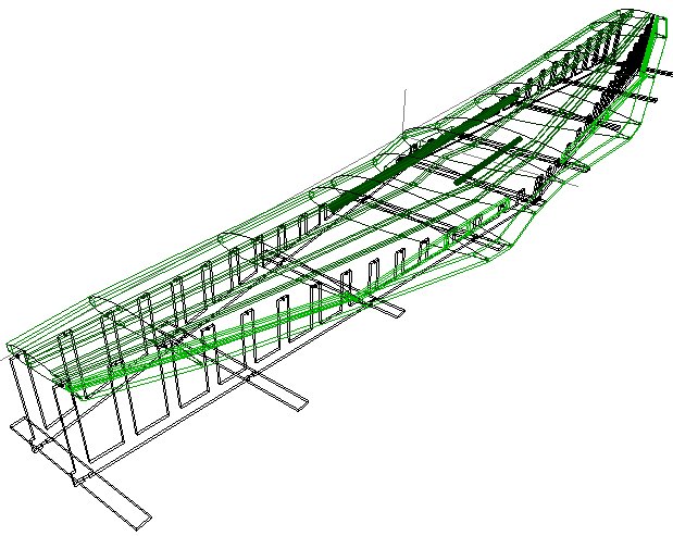 Ein Screenshot aus dem CAD-Programm (durch die Verkleinerung etwas verzerrt) zeigt die Lage der Spanten. Zur Illustration sind einige der Spanten unter der Rumpfkonstruktion platziert Sie sind alle mit Aufstellbeinen versehen, die in der Helling-Konstruktion wieder Verwendung finden. Die meine Fräsmaschine nicht die gesamte Länge zur Verfügung stellen kann, ist die Helling über ihre Länge zweigeteilt. Sie besteht immer aus dem "Kamm" zur Aufstellung der Spanten und den Querverbindern.