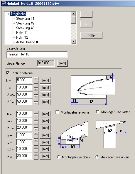 Die Tragflächen sind entstanden neu mit der Hilfe des Wing-Designer von Step-Four. Der Plan aus der FMT verwendet als Tragflächenprofil ein Clark-Y. Das hat den Vorteil, das wegen der geraden Unterseite der Bau der Fläche ohne weitere Hilfmittel recht einfach ist. Meine Lieblingsprofile sind NACA-2412 und NACA-2415. Mit dem Wing-Designer können sehr leicht Aufbau-Hellinge konstruiert werden, so dass man die konvexe Unterseite nicht zu fürchten braucht. Für die Heinkel He116 habe ich mich für das NACA-2415-Profil mit 1,5 grad Anstellwinkel entschlossen. Das Flugzeug soll langsam fliegen und wird ein dickes Profil in Verbindung mit der großen Flächentiefe daher recht gut vertragen.