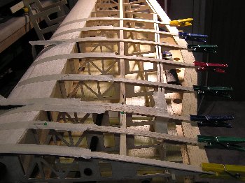 Ich habe die Beplankung der Unterseite in zwei Hälften (vorne und hinten) vorgenommen. Die Arbeit mit den langen Balsastreifen war mir dann doch etwas zu unbequem.