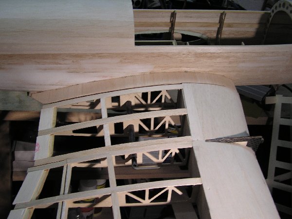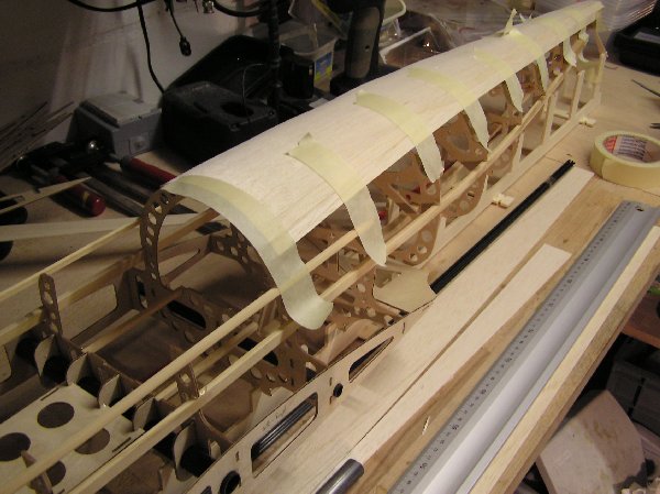 Das Beplanken dieses Modells ist leider aufwändig, da die Rumpfoberfläche sphärisch gekrümmt ist. Damit kann nicht einfach eine Platte über die Rundung gezogen werden, sondern segmentweises Vorgehen ist erforderlich. Ich verwende hier zum Verkleben Ponal-Express.