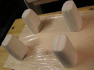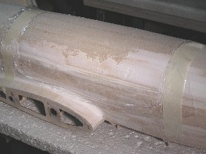 Die Motorhauben für die Motorgondeln sind aus GFK gefertigt. Dazu habe ich zuerst die Formen aus Styrodur hergestellt. Sie wurden dann mit 25g-Glasgewebe überzogen, bis die gewünschte Dicke erreicht wurde. Das leichte Gewebe hat den Vorteil, dass es sich einfach um die relativ scharfen Rundungen ziehen lässt, ohne irgendwelche Widerspenstigkeiten zu zeigen. Die weitere Beabeitung der Hauben besteht dann aus Spachteln und Feinschleifen mit Nass-Schliff am Ende, um sie dann mit Sprühlack Schwarz lackieren zu können.