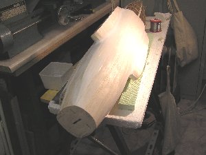 Die Beplankung der Oberseite ist inzwischen bis zur Profilsehne der Tragflächen fortgeschritten, so dass der Rumpf aus der Helling für die Weiterarbeit herausgelöst werden muss.