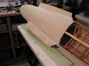 Auch die in den Rumpf integrierten Tragflächenwurzeln werden vollständig beplankt. Zur Einhaltung des Profils ist das Balsaholz mit Styrodur®-Stückchen unterstützt, die sowohl dem NACA-Profil folgen, als auch der 6°-Negativ-V-Form entsprechen. Mit dem EPS-Schneider von z.B. Proxxon lassen sich die Teile recht komfortabel herstellen. Auf dem übernächsten Bild sind die Stücke ansatzweise zu erkennen.