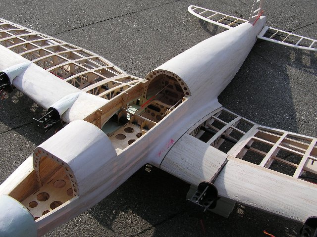 Das bespannen der Flächen habe ich aus Bequemlichkeitsgünden in mehreren Schritten vollzogen. Bei einer so großen Fläche - die zudem auch noch geknickt ist - kommt es sonst schnell mal zu Verwerfungen, die dann nachträglich nur noch schwer zu korrigiern sind. Wenn man mit der Nase zu Nahe an das Modell kommt, sieht man zwar hinterher die feinen Ansätze, ich habe es aber einfach in Kauf genommen.