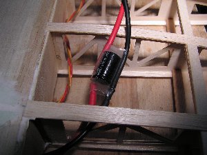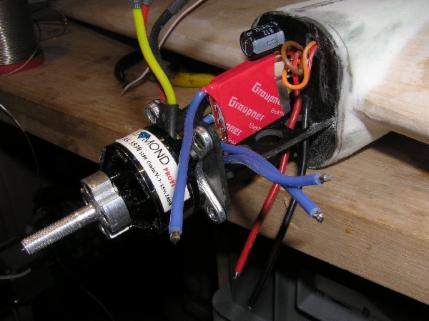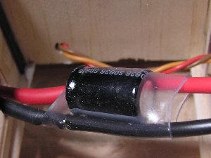 Die Regler passen bei mir nicht im Originalzustand in die Motorgondeln. Ich habe dafür den Kondensator so umgelötet, dass er außen von der Platine Platz findet und habe den Regler neu eingeschrumpft. Die Regler sind 35A Dymond-Regler, die mit 4 LiPo-Zellen gut zurecht kommen sollten. Das BEC dieser Regler wird bei mir in diesem Projekt nicht benötigt. Auch die bestehenden Anschlusskabel bereiten Platzprobleme, so dass die Steuerleitungen ebenfalls neu angelötet wurden.