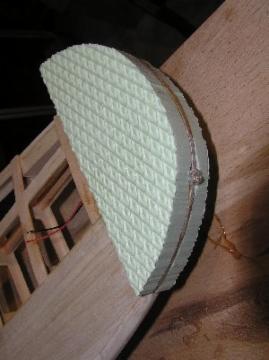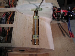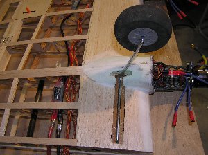 | Die Grundlage für die Radbefestigung besteht in einem 4-Kant-Holz aus Teak, in das eine Nut für den Torsionsstab eingefräst wurde. Am unteren Bildende greift der Torsionsstab mit eine Knick in eine Bohrung und hält so das Rad-Bein in Position. Zwei kleine GFK-Laschen halten das Fahrwerk in der Nut fest. |