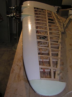 ![]() | Nach der Fertigstellung der gesamten Flächenverkabelung sind sowohl die Servos als auch die Energieversorgungen verlötet und die Lötstellen mit Schrumpfschlauch überzogen. Die Motorgondeln sind aus Styrodur hergestellt, so dass das CFK-Skelett seine typische Form erhält. Ebenso is die Aufdickung des Randbogens aus Styrodur.