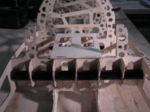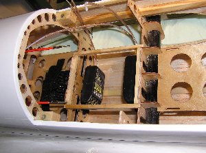 ![]() | Die Spanten berücksichtigen bereits die Akkurutsche, die Auflager sowie Halterungen für die Steckungen und für die Bowdenzüge. Bekanntlich ist ja das Material am leichtesten, das gar nicht da ist. Deshalb ist die sinnvolle Einbringung von Erleichterungslöchern unerlässlich für den angestrebten Leichtbau. Auch wenn die Löcher hier zunächst nach einer Schwächung des Spants aussehen, so spielt das im zusammengebauten Zustand keine Rolle mehr. Die diversen Passnuten sind dann wieder mit Leisten ausgefüllt, die mit Hilfe von 5-Minuten-Expoy eingeklebt werden. Diese Klebung ist belastbarer als das zusammengefügte Material... |