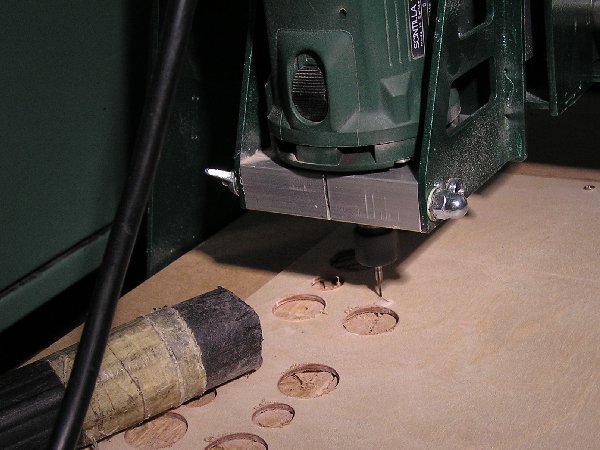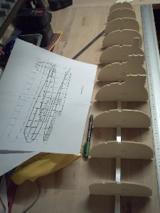 Die äußere Kontur wurde von den konstruierten Spanten übernommen und aus einer Sperrholzplatte aus billigem Pappelholz ausgeschnitten. Die Fräsmaschine leistet dabei die besten Dienste. Dabei werden für eine Alu-Schiene stramm passende Aussparungen in deren Querschitt gefräst, so dass die Spantmodelle in den erforderlichen Abständen auf dieser Schiene platziert werden können. Eine weitere Fixierung war nicht erforderlich.