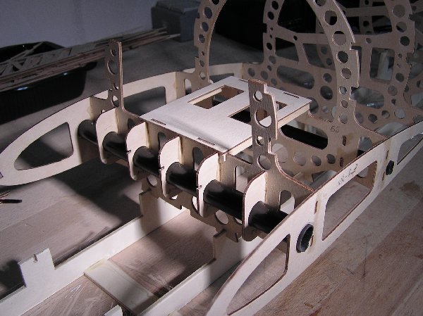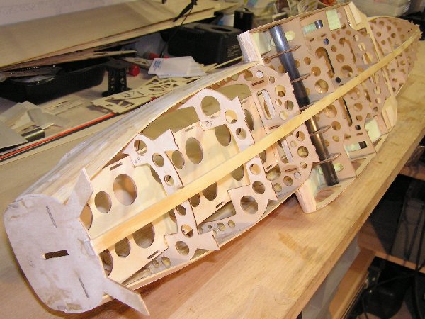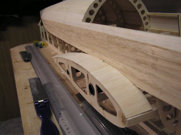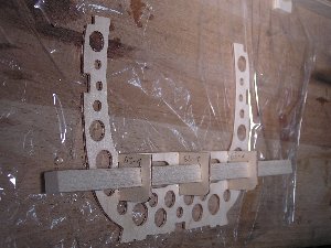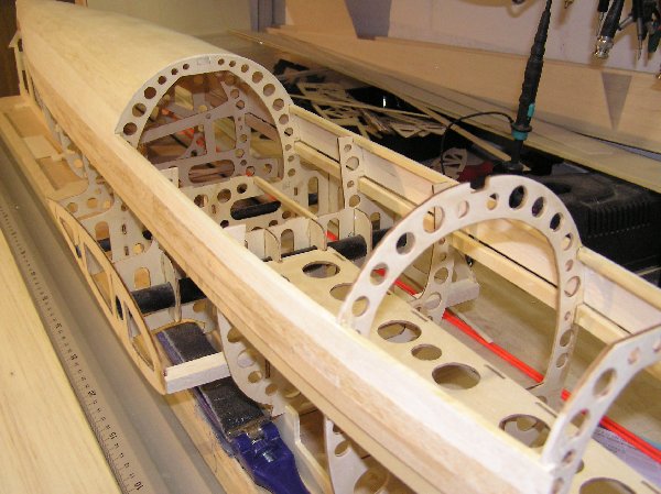 Die Einzelteile der Tragflächengruppe sowie der Akkurutsche werden vor dem Weiterbau mit 5-Minuten-Epoxy verklebt. Das Servobrett im letzten o.a. Foto wird nicht eingeklebt, sondern zur winkelrichtigen Ausrichtung während des Aushärtungsvorganges nur vorsichtig aufgeklemmt. Ich habe die Verschraubung geplant, damit es später auch mal entfernt werden kann. Der Empfänger soll an der Rückseite des Spantes platziert werden und muss durch Abnehmen des Servobretts auch mal erreicht werden können. Die Rumpfholme bestehen aus Kiefernleisten werden ebenfalls mit 5-Minunten-Epoxy eingeklebt. Insbesondere im Bugbereich ergibt sich eine starke Krümmung der Leisten, so dass hier mit Schraubzwingen gehalten werden muss, bis das Harz vollständig ausgehärtet ist. | ![]() |