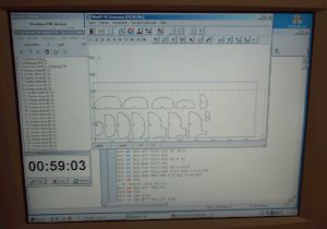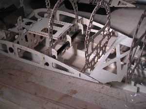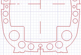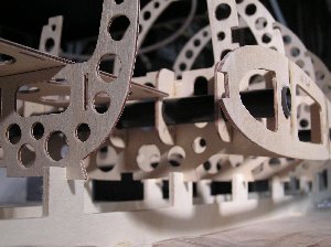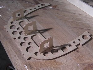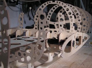 Nachdem der komplette Rumpf konstruiert wurde, erfolgte die Programmierung der Fräsmaschine zur Herstellung der Rumpfspanten. Ein paar Details dazu stehen im Bericht "TRON-Fräse" auf dieser Webseite. Beim Ausschneiden der Spanten und sonstigen Teile fängt man immer innen mit den Löchern an und arbeitet sich dann nach und nach zur Außenkontur vor bis das fertige Werkstück aus der Rohplatte heraus fällt. Die erreichbare Präzision ist so gut, dass die fertigen Teile anschließend nach dem Enfernen des Grats perfekt ineinander passen. Ich empfehle, vor Beginn der letzten Details in der Konstruktion das Material zusammengekauft zu haben. Oft sind in der Plattendicke oder auch bei Leistenmaterial Maßabweichungen vorhanden, die man dann vor Fräsbeginn noch berücksichtigen kann, was insbesondere bei Nut-Feder-Verbindungen sehr wichtig ist.. Oder man greift etwas tiefer in die Tasche und kauft gleich selektiertes Material.