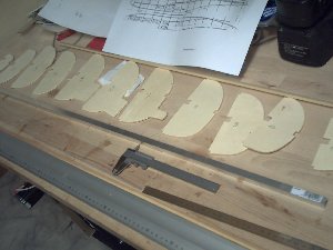 Für den Bau des Tragflächenskelets wird zunächst die Helling montiert - jeweils eine Helling für jede Seite. Ich habe die Helling aus Pappelsperrholz gefräst. Baumarkt-Qualität ist zwar dafür im Prinzip ausreichend, jedoch sollte man unbedingt darauf achten, dass die Fasern der äußeren Schichten entlang der langen Seite der Helling verlaufen, sonst wird das Gebilde zu wabbelig. Bei zukünftigen Projekten werde ich wohl insbeondere die längeren "Kammzinken" durch zusätzliche Querverbinder versteifen. Die Ausgabe der Daten für die Helling kommt aus dem Wing-Designer perfekt als DXF-File heraus, so dass die "Kämme" direkt gefräst werden können. Für die Maßkontrolle der Helling habe ich vollständig bemaßte Zeichnungen geplottet und alles akribisch nachgemessen. Mein Vertrauen in die gefrästen Ergebnisse wuchs auf einmal sprunghaft an... Die nachfolgenden Bilder zeigen ein paar Schritte der Bauphasen. Sehr schön ist zu erkennen, dass die Rippen aus dem Wing-Designer perfekt in die Helling passen. Ich baue die Flächen zunächst als ganzes Teil und werde die Klappen für Querruder und Landeklappen erst nach der kompletten Teilbeplankung ausschneiden. | ![]() |